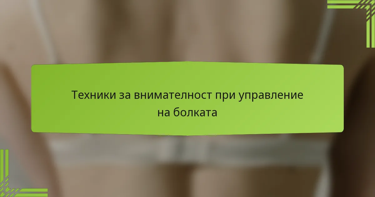 Техниките за внимателност при управлението на болката включват фокусиране на осъзнаването върху настоящия момент, за да се облекчи дискомфортът и да се подобри общото благосъстояние. Тези практики могат да помогнат на индивидите да управляват хроничната болка, като променят отношенията си с болката и намаляват стресовите реакции.